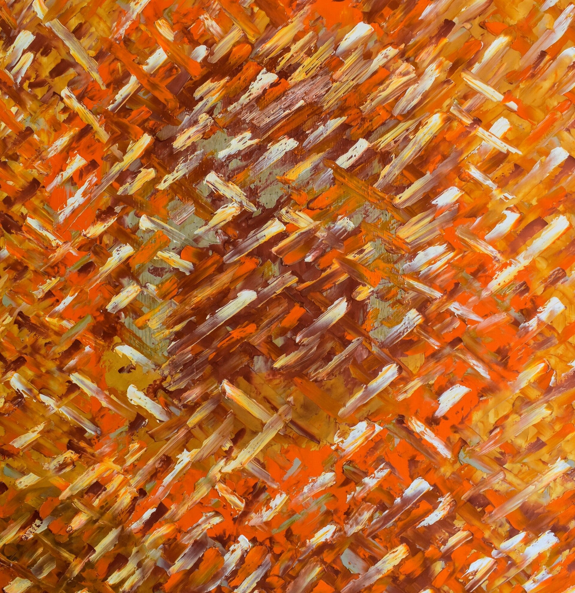The dominant colors are a vibrant array of oranges, from deep terracotta and fiery rust to bright tangerine and goldenrod. These are interspersed with flashes of warm yellows, creamy whites, and hints of muted browns, all blending and contrasting to evoke the nuanced palette of a sunset sky. The sharp strokes are applied in a cross-hatching or basket-weave pattern, creating a sense of interwoven light and shadow, as if the light itself is being braided across the canvas.